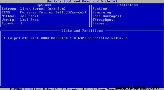 其中F2 查看帮助信息,F3是DBAN命令列表,F4读取RAID设备,输入“Enter”进入交互模式,输入“autonuke” 就开始进行全盘数据删除。