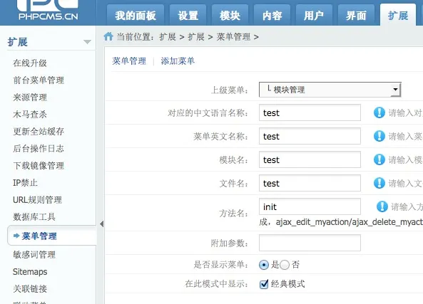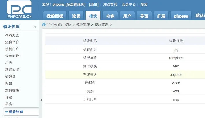 我们要开发的东东(也就是模块)就在/phpcms/modules/下面新建一个my目录 其目录下的目录有 classes functions templates -------这里的目录是后台modules
