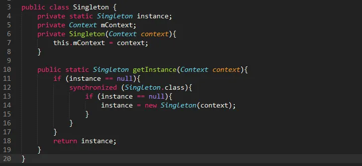 如果我们在在调用Singleton的getInstance()方法时传入了Activity。那么当instance没有释放时,这个Activity会一直存在。因此造成内存泄露。