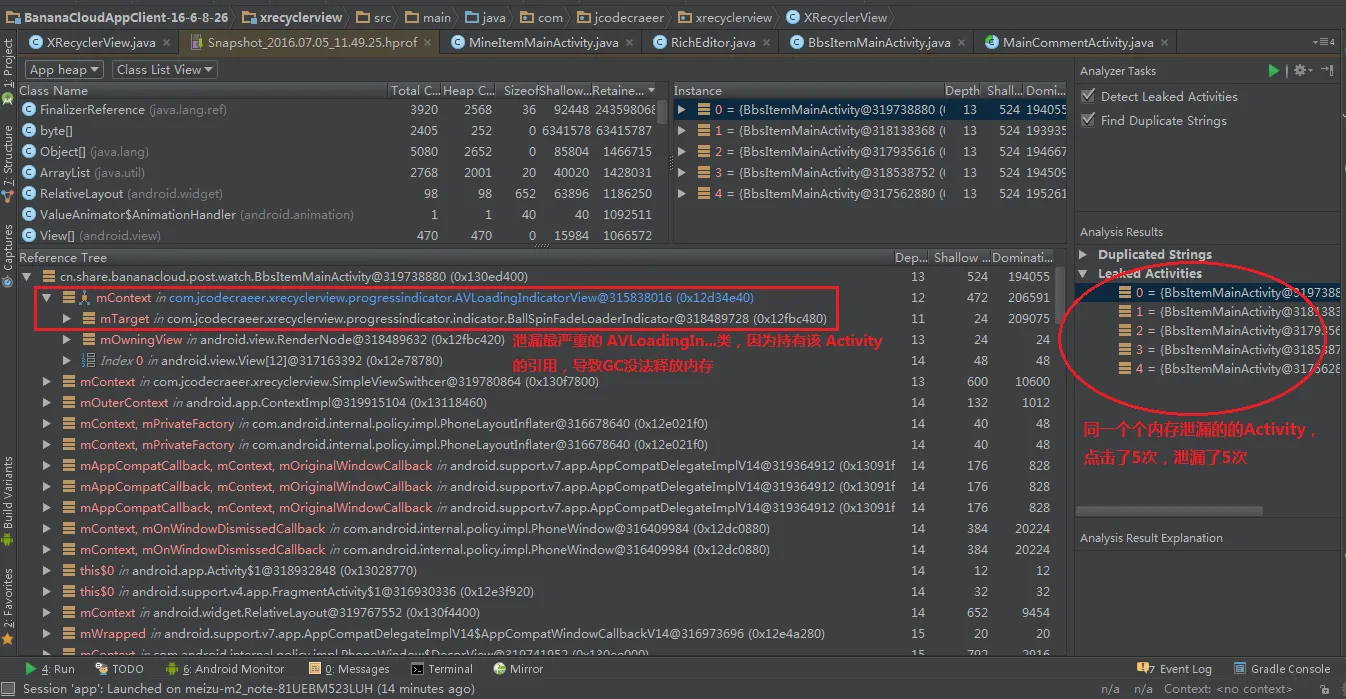 观看JavaHeap,点击Analyzer Task,Android Monitor就可以为我们自动分析泄漏的Activity啦,分析出来如下图所示