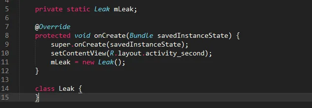 mLeak是存储在静态区的静态变量,而Leak是内部类,其持有外部类Activity的引用。这样就导致Activity需要被销毁时,由于被mLeak所持有,所以系统不会对其进行GC,这样就造成了内存泄漏。
