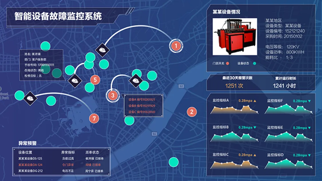通过设备监控预警大屏,既能够全局把握所有设备的分布,对潜在的设备故障进行预警,并通过交互了解每一个设备的运转状况,以及维修人员工单的完成状态,有利于设备管理维护单位对设备运检效率的提升。