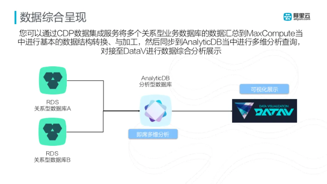- 多种数据源接入,充分发挥阿里云大数据计算的能力:能够接入包括阿里云分析型数据库,关系型数据库,本地CSV上传和在线API的接入,且支持动态请求。满足用户各类大数据实时计算、监控的需求,充分发挥大数据计算的能力。