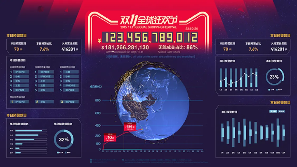 想必大家都或多或少看过2015年双11的直播大屏,又酷又炫!这个直播大屏背后实际上是由DataV数据可视化技术搭建而成,结合阿里云流计算StreamCompute,把所有业务当天实时的情况呈现在大屏幕上。