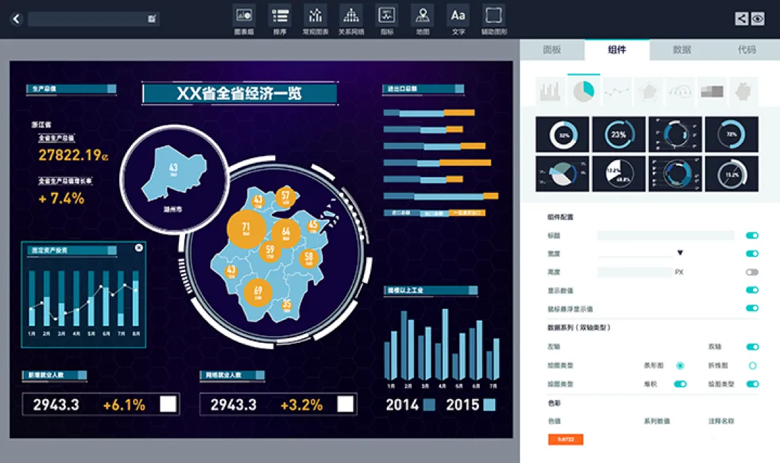 - 图形化的搭建工具,无需专业编程人员也可快速实现:提供多种的业务模块级而非图表组件的Wiget,所见即所得式的配置方式,用户只需要通过拖拖拽拽,无需编程能力,即可创造出专业的可视化应用。