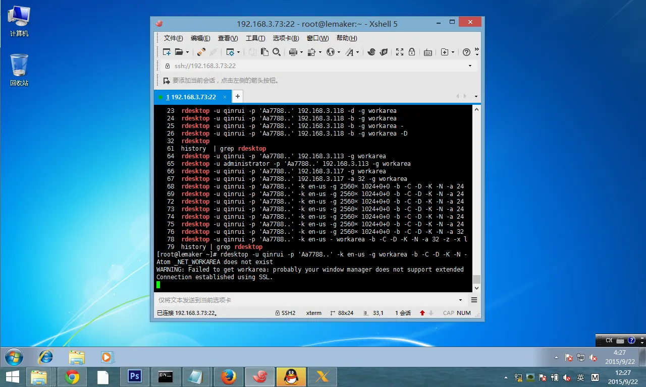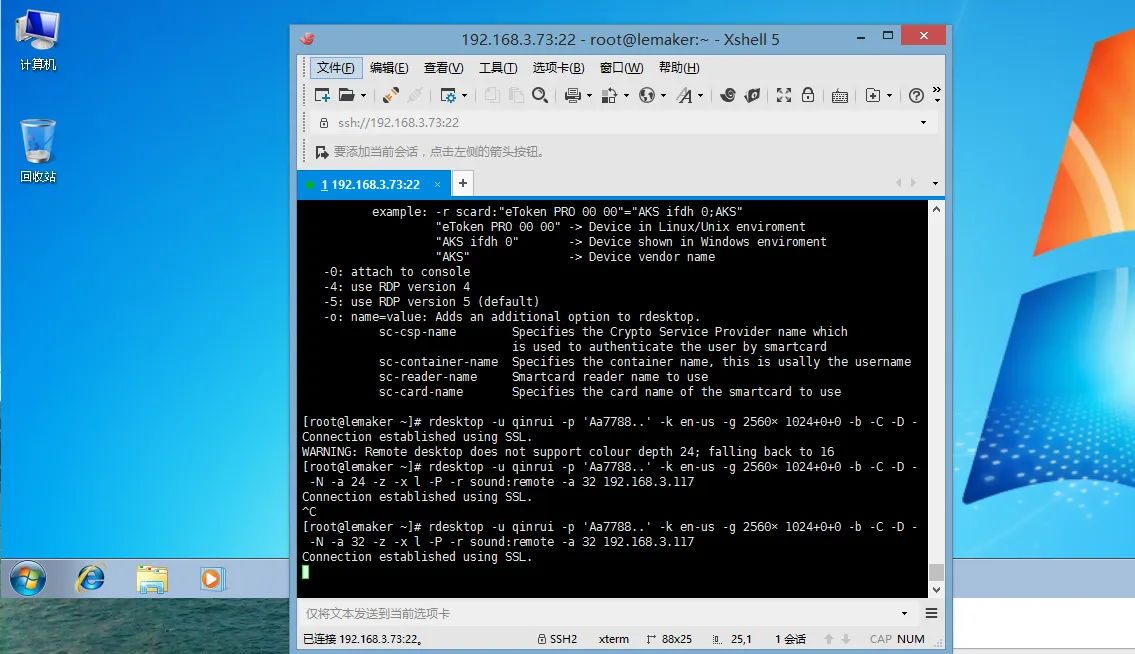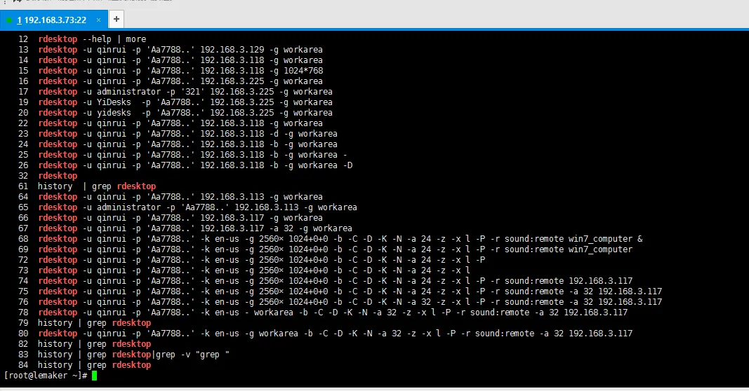 rdesktop -u qinrui -p 'Aa7788..' -k en-us -g 2560×1024+0+0 -b -C -D - -N -a 32 -z -x l -P -r sound:remote -a 32 192.168.3.117