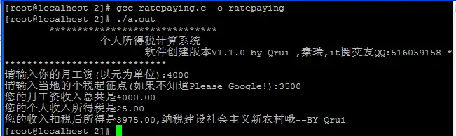 62 printf("您的收入扣税后所得是%.2lf,纳税建设社会主义新农村哦--BY Qrui\n",earnnum-tax);
