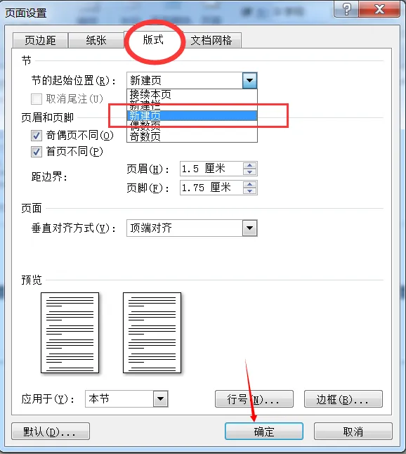 弹出“页面设置”对话框,找到“板式”,将节点起始位置由“新建页”,选择为“持续本页”。
