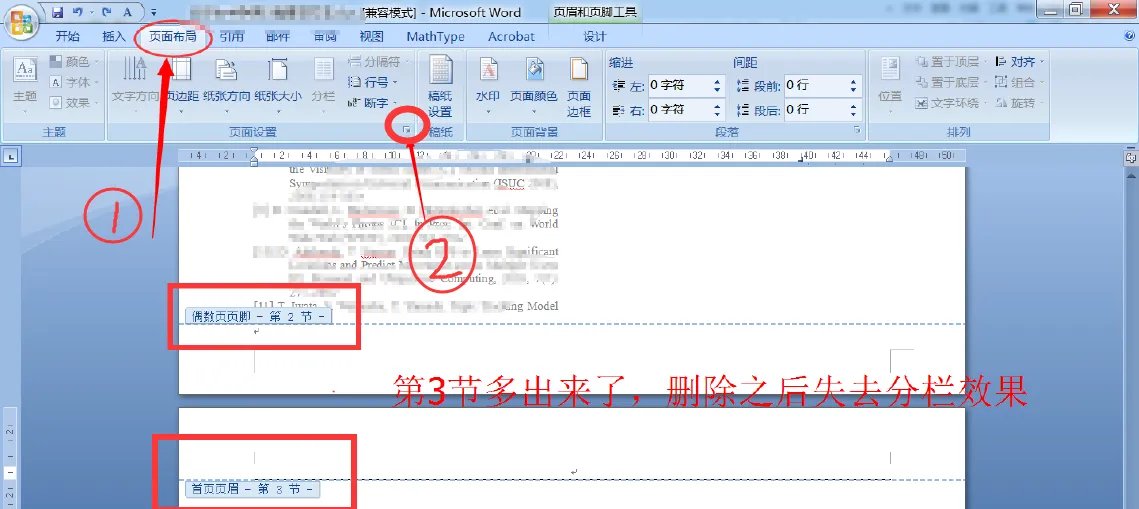 鼠标放在最后一页,点击页面布局①,选择页面布局右下角的图标②。