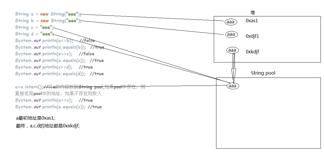 虽然两个语句都是返回一个String对象的引用,但是jvm对两者的处理方式是不一样的。对于第一种,jvm会马上在heap中创建一个String对象,然后将该对象的引用返回给用户。对于第二种,jvm首先会在内部维护的strings pool中通过String的 equels 方法查找是对象池中是否存放有该String对象,如果有,则返回已有的String对象给用户,而不会在heap中重新创建一个新的String对象;如果对象池中没有该String对象,jvm则在heap中创建新的String对象,将其引用返回给用户,同时将该引用添加至strings pool中。注意:使用第一种方法创建对象时,jvm是不会主动把该对象放到strings pool里面的,除非程序调用 String的intern方法。看下面的例子: