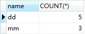 首先进行分组工作,group by name,这时8条数据被分成两组:dd和mm;然后count的作用就是统计每组里面的个数,分别是5和3.
