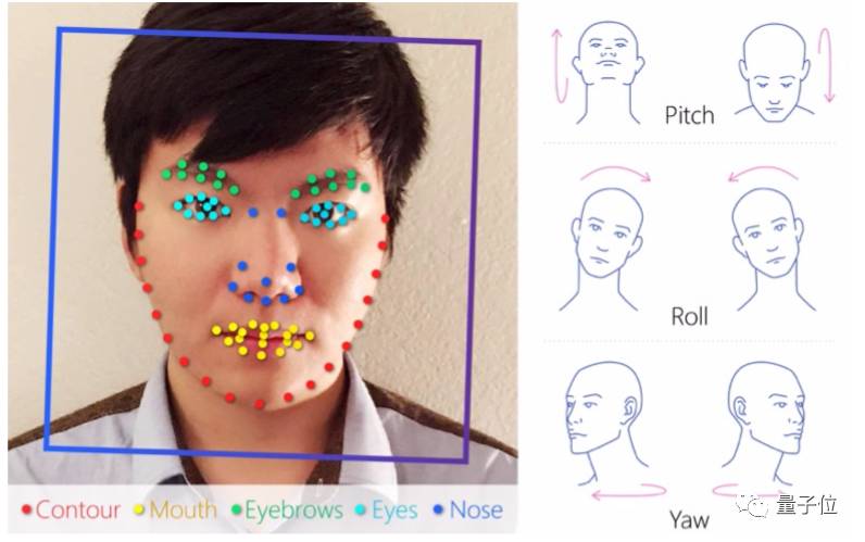 △ 研究人员先标记面部特征,同时用倾斜度、转动和偏转角度等参数定位人脸