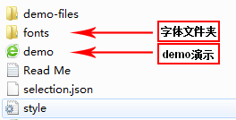 这时可以看到我们刚刚选择的几个图标字体已经生成,点击下载此文件后会得到icomoon.zip的文件。解压后会看到里面有适合各个浏览器的字体以及demo演示: