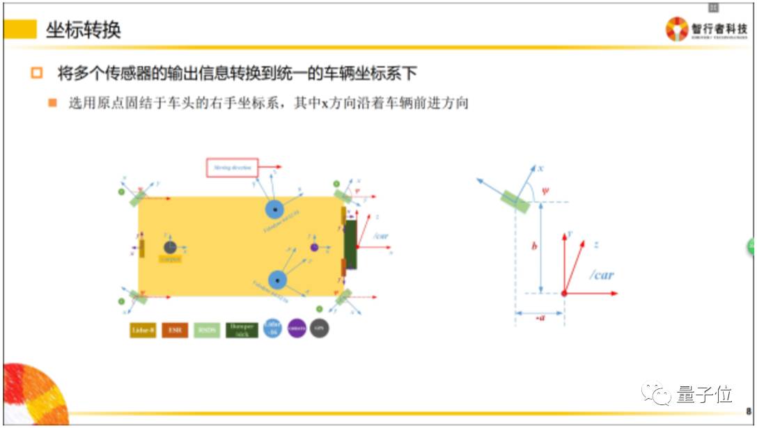 传感器是安装在不同地方的,比如超声波雷达(上图中橘黄色小区域)是布置在车辆周围的;当车辆右方有一个障碍物,距离这个超声波雷达有3米,那么我们就认为这个障碍物距离车有3米吗?