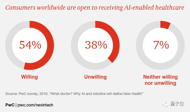 从健身咨询到小手术,普华永道对全球12个国家的12000人进行的调查,结果说明大多数消费者愿意使用AI和机器人技术替代人类医生的护理。全球有54%的消费者愿意考虑非传统的管理和健康方案。