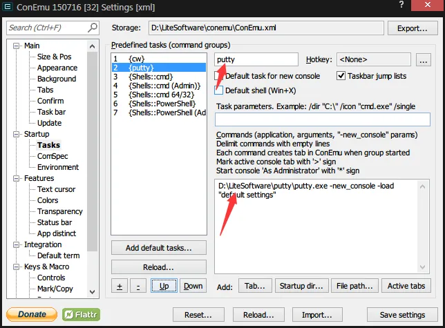 D:\LiteSoftware\putty\putty.exe -new_console -load "default settings" |