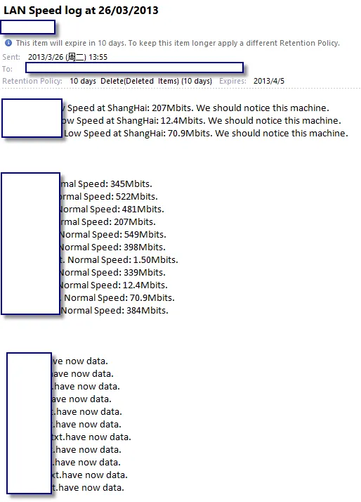 1 #!/usr/bin/env python 2 import sys 3 import os.path 4 from smtplib import SMTP 5 import datetime 6 7 8 folder = 'D:\Iperf\Log\\' 9 msg_low_sh = '' 10 msg_normal = '' 11 msg_low_us = '' 12 msg_nodata = '' 13 for filename in os.listdir (folder): 14 #print(filename) 15 16 fp = open(folder + filename,'r') 17 18 for i, line in enumerate(fp): 19 if (i == 0 and line == "") or (len(line) < 3 ): 20 msg_nodata += filename + ".have now data.\n" 21 elif (i == 6): 22 speednumber = line.split() 23 if (float(speednumber[6])) < 300 and (float(speednumber[6])) > 8: 24 msg_low_sh += filename + ". Low Speed at ShangHai: " + speednumber[6] + "Mbits. We should notice this machine.\n" 25 if (float(speednumber[6])) <1.0: 26 msg_low_us += filename + "Low Speed at US: " + speednumber[6] + "Mbits. We should notice this machine.\n" 27 else: 28 msg_normal += filename + ". Normal Speed: " + speednumber[6] + "Mbits.\n" 29 fp.close() 30 #print (msg_low_sh) 31 #print (msg_low_us) 32 #print (msg_normal) 33 #print (msg_nodata) 34 35 text_file = open("LANSpeedOutput.txt", "w") 36 37 text_file.write(msg_low_sh) 38 text_file.write(msg_low_us) 39 text_file.write("\n\n\n") 40 text_file.write(msg_normal) 41 text_file.write("\n\n\n") 42 text_file.write(msg_nodata) 43 44 text_file.close() 45 46 debuglevel = 0 47 48 smtp = SMTP() 49 smtp.set_debuglevel(debuglevel) 50 smtp.connect('X.X.X.X', 25) 51 smtp.login('xxx', 'xxx') 52 53 from_addr = "<xxx>" 54 to_addr = ["xxx","xxx","xxx"] 55 date = datetime.datetime.now().strftime( "%d/%m/%Y " ) 56 fp = open(r'LANSpeedOutput.txt', 'r') 57 58 subj = "LAN Speed log at "+date 59 message_text = fp.read() 60 61 msg = "From: %s\nTo: %s\nSubject: %s\nDate: %s\n\n%s" % ( from_addr, to_addr, subj, date, message_text ) 62 63 smtp.sendmail(from_addr, to_addr, msg) 64 smtp.quit()