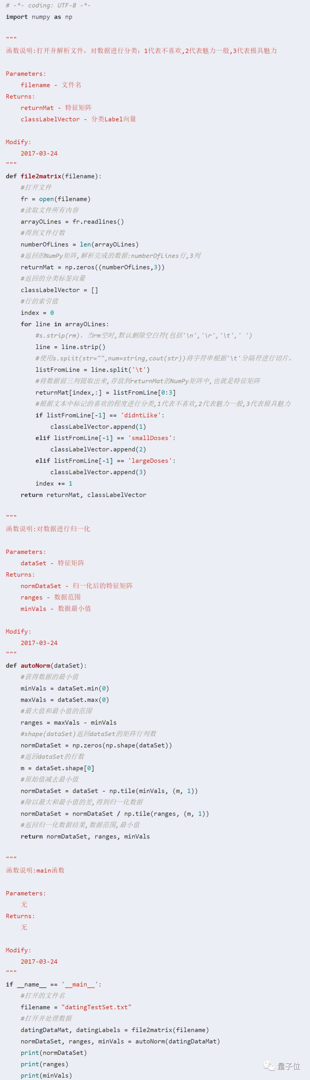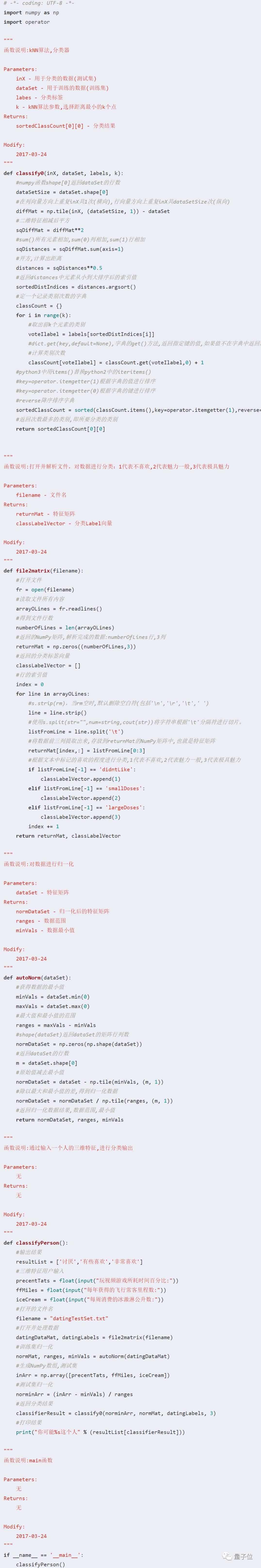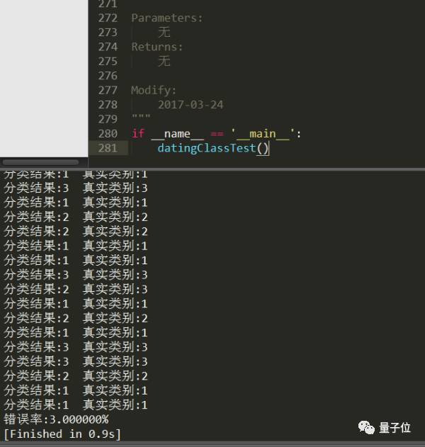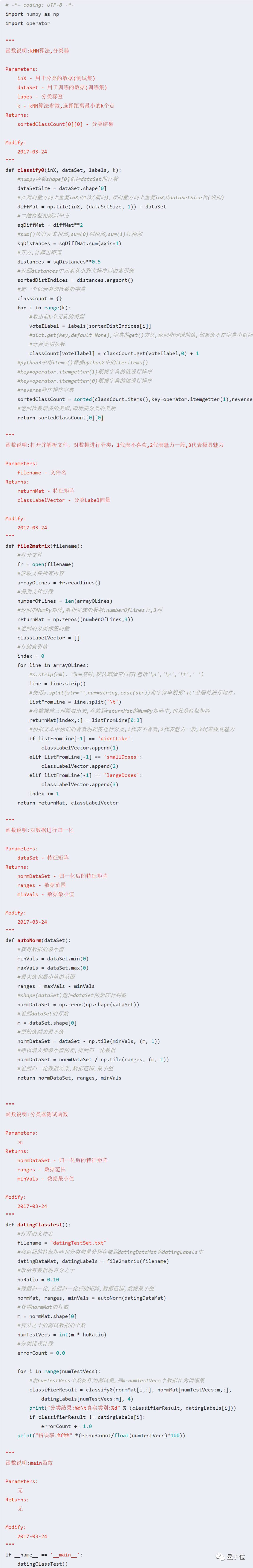 需要注意的是,10%的测试数据应该是随机选择的,由于海伦提供的数据并没有按照特定目的来排序,所以我么你可以随意选择10%数据而不影响其随机性。