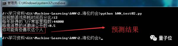在cmd中,运行程序,并输入数据(12,44000,0.5),预测结果是”你可能有些喜欢这个人”,也就是这个人魅力一般。一共有三个档次:讨厌、有些喜欢、非常喜欢,对应着不喜欢的人、魅力一般的人、极具魅力的人。结果如图2.6所示。