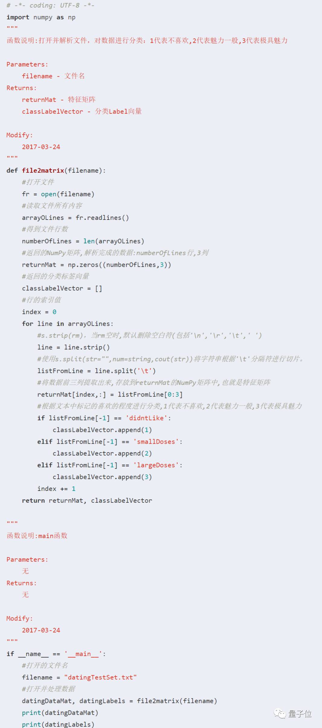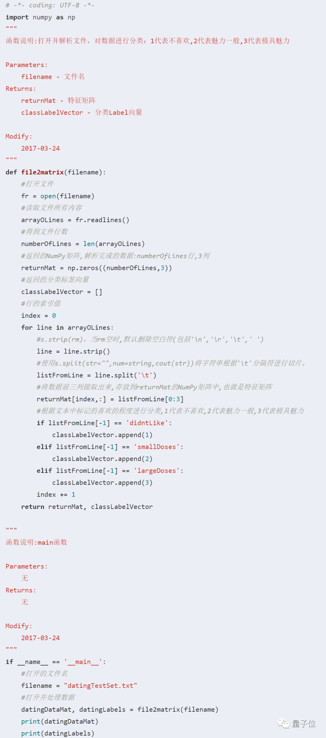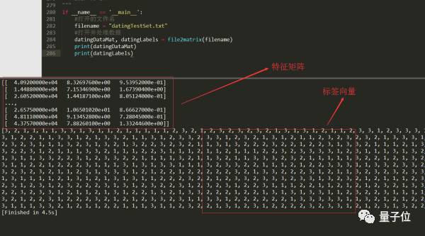 从上小结已经知道,要将数据分类两部分,即特征矩阵和对应的分类标签向量。在kNN_test02.py文件中创建名为file2matrix的函数,以此来处理输入格式问题。 将datingTestSet.txt放到与kNN_test02.py相同目录下,编写代码如下: