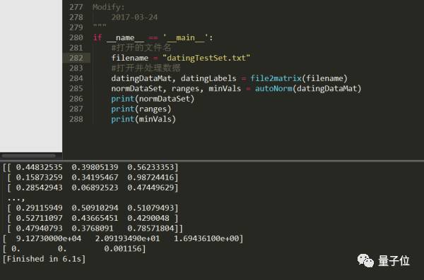 从图2.4的运行结果可以看到,我们已经顺利将数据归一化了,并且求出了数据的取值范围和数据的最小值,这两个值是在分类的时候需要用到的,直接先求解出来,也算是对数据预处理了。