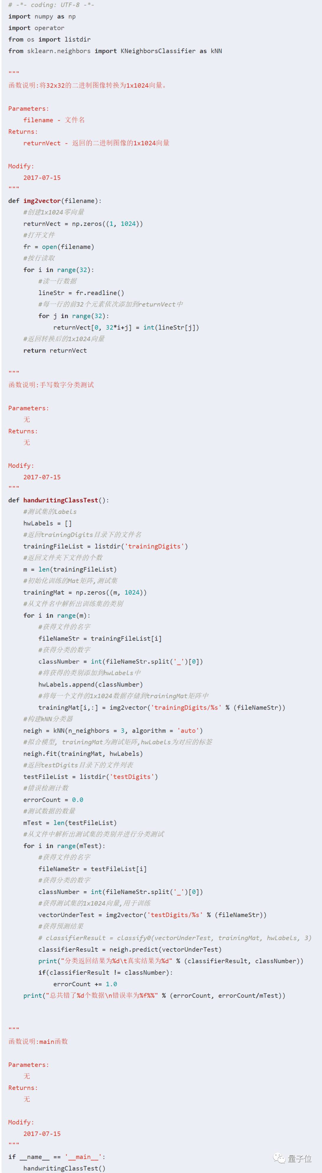 这里不再讲解自己用Python写的k-邻域分类器的方法,因为这不是本小节的重点。接下来,我们将使用强大的第三方Python科学计算库Sklearn构建手写数字系统。
