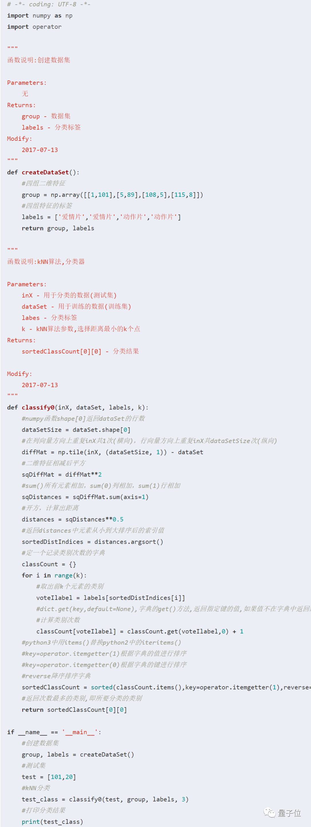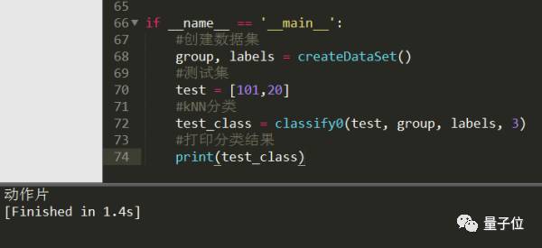 根据两点距离公式,计算距离,选择距离最小的前k个点,并返回分类结果。