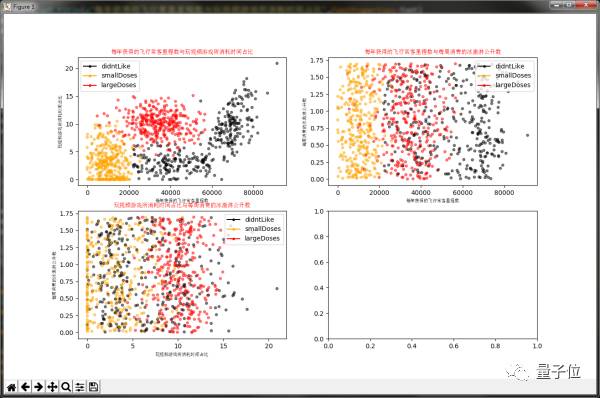 通过数据可以很直观的发现数据的规律,比如以玩游戏所消耗时间占比与每年获得的飞行常客里程数,只考虑这二维的特征信息,给我的感觉就是海伦喜欢有生活质量的男人。