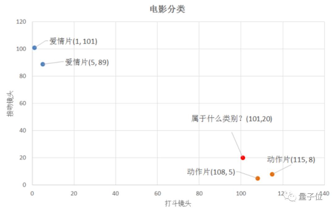 我们可以从散点图大致推断,这个红色圆点标记的电影可能属于动作片,因为距离已知的那两个动作片的圆点更近。k-近邻算法用什么方法进行判断呢?