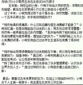 最后给贴一下今天各大群热传的励志文:月领1万2小IT职员五年在北京买500万房子~~