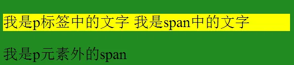 <!DOCTYPE html> <html> <head> <meta charset="UTF-8"> <title></title> <style type="text/css"> body{ font-size: 30px; background-color: forestgreen; } </style> </head> <body> <div style="background-color: yellow;"> <p> 我是p标签中的文字 <span>我是span中的文字</span> </p> </div> <span>我是p元素外的span</span> </body> </html>