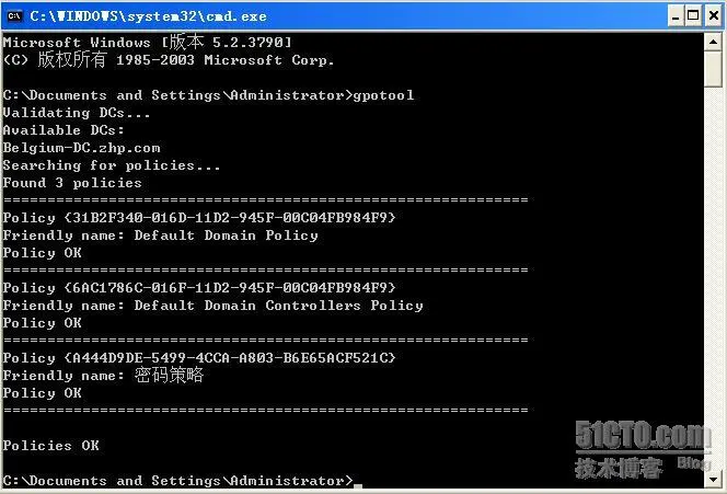 1、检测当前域上所有组策略的正常配置,在命令提示符下键入:gpotool 回车,运行后的结果显示如下图: