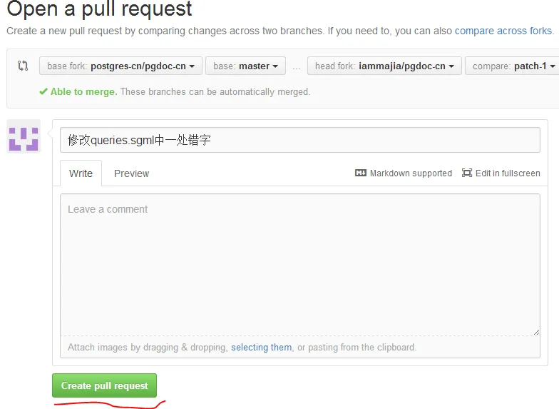 需要的话,在推送请求里写点说明,再点击“Create Pull request”。这时Pull request就已经发出去了。