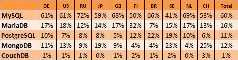 有一个比较奇怪的现象是,在被认为PostgreSQL普及程度于MySQL不相上下的日本(JP),PostgreSQL的使用率居然还没有达到平均水平。难道说日本的用户把PostgreSQL和MySQL的使用场景分的很清,Web用MySQL,企业应用用PostgreSQL?