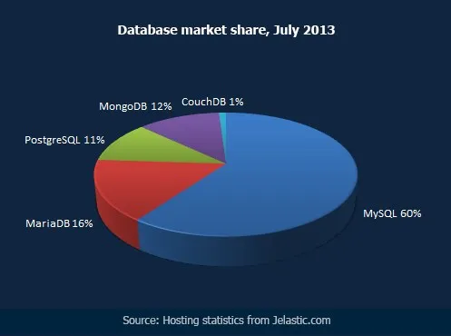 Jelastic是一个在线的支持 Java 和 PHP 的 PaaS 服务平台。它每个月都会统计一次在Jelastic上使用的同类开源软件的使用份额。最近一次的统计结果(2013/8/5)显示,MySQL依然毫无争议地是目前使用最广的开源数据库。