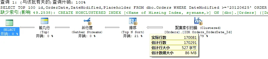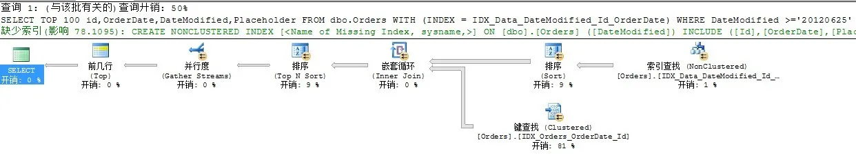 现在来说说为什么非分区索引性能在这里比分区的好,分区索引是根据分区方案,分别存放,如前面的例子直接使用某个值来过滤,索引查找会扫描所有分区,查询那些数据,那么它读取的页远远大于直接在非聚集索引中seek,自己运行demo,查看非聚集索引seek左边的排序,是根据orderdate,id排序,视乎在为了给嵌套循环做准备,之后还要根据datemodified,id排序。非分区索引严格按照排序的字段排序,因此看执行计划的时候看实际相应行数为100,但是看走分区索引的实际相应行数则为170081也就意味着走非分区索引加大了IO,和多余的计算。恰恰造成查询偏慢的原因就是因为分区的阴暗面。不恰当的使用分区。CareSon的博文让我对分区表和索引对齐有了更加深入的认识。