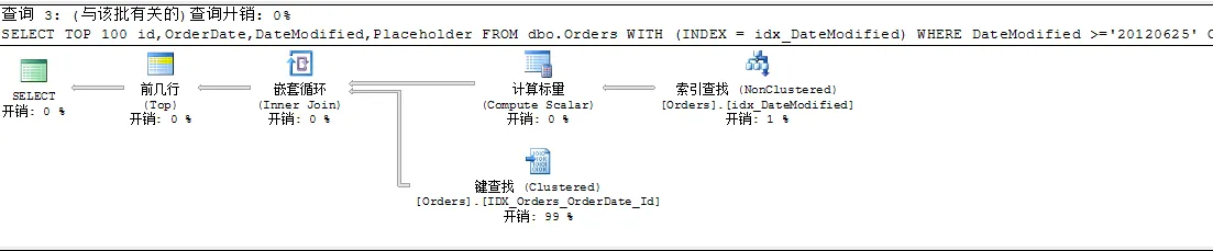 SELECT TOP 100 id,OrderDate,DateModified,Placeholder FROM dbo.Orders WITH (INDEX = idx_DateModified) WHERE DateModified >='20120625'