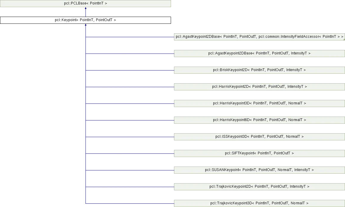 (1)class pcl::Keypoint<PointInT,PointOutT> 类keypoint是所有关键点检测相关类的基类,定义基本接口,具体实现由子类来完成,其继承关系时下图: