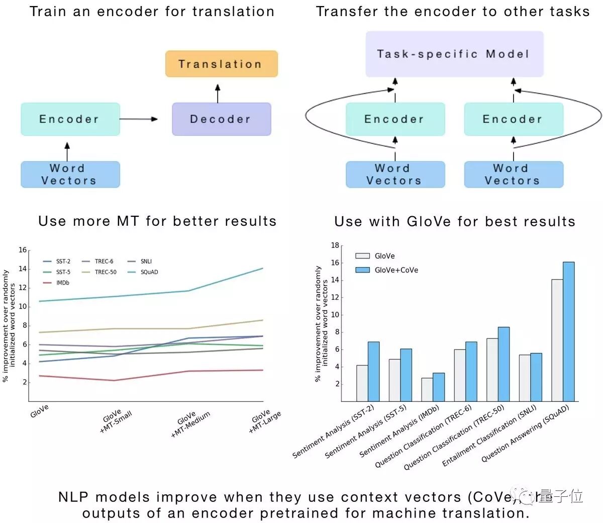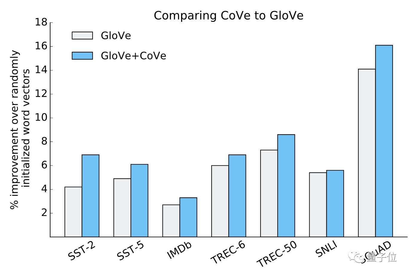 然后,他们把CoVe用到了语义情感分析、问题分类、文本蕴含、问答等多种NLP任务上,这些模型的性能都得到了提升。