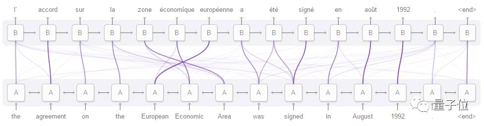 △ GNMT英译法的注意力机制示意图。