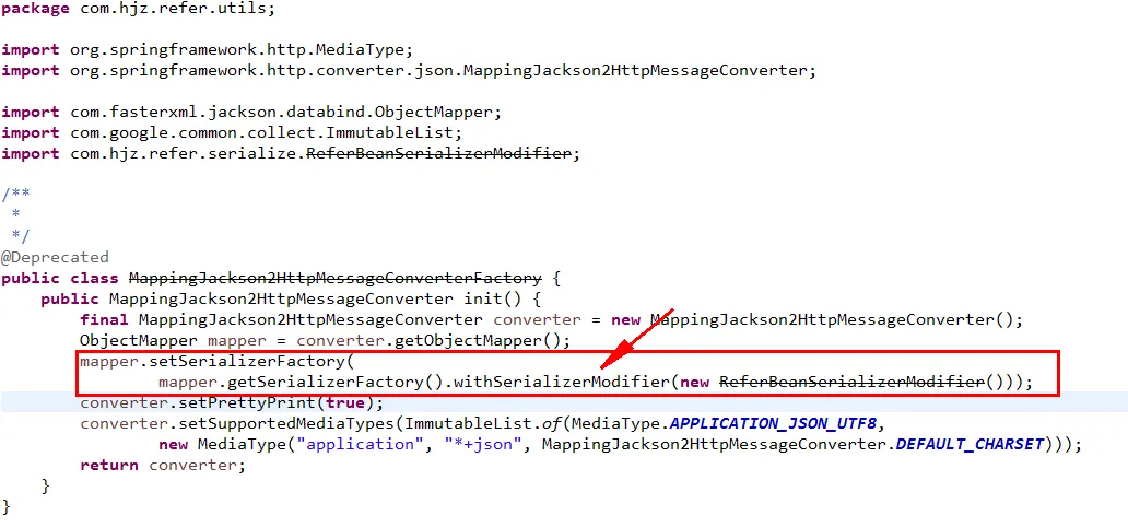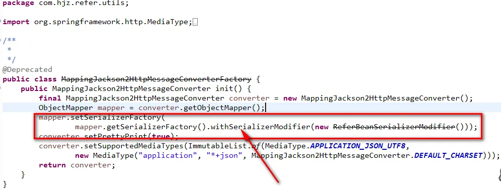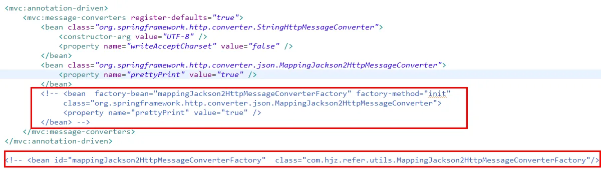 <mvc:annotation-driven> <mvc:message-converters register-defaults="true"> <bean class="org.springframework.http.converter.StringHttpMessageConverter"> <constructor-arg value="UTF-8" /> <property name="writeAcceptCharset" value="false" /> </bean> <bean factory-bean="mappingJackson2HttpMessageConverterFactory" factory-method="init" class="org.springframework.http.converter.json.MappingJackson2HttpMessageConverter"> <property name="prettyPrint" value="true" /> </bean> </mvc:message-converters> </mvc:annotation-driven> <bean id="mappingJackson2HttpMessageConverterFactory" class="com.hjz.refer.utils.MappingJackson2HttpMessageConverterFactory"/>
