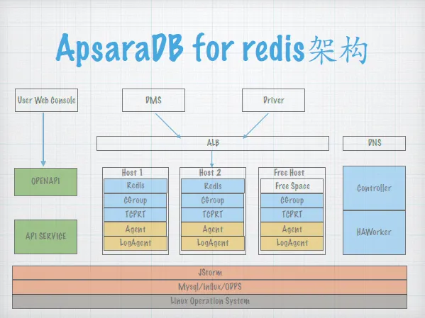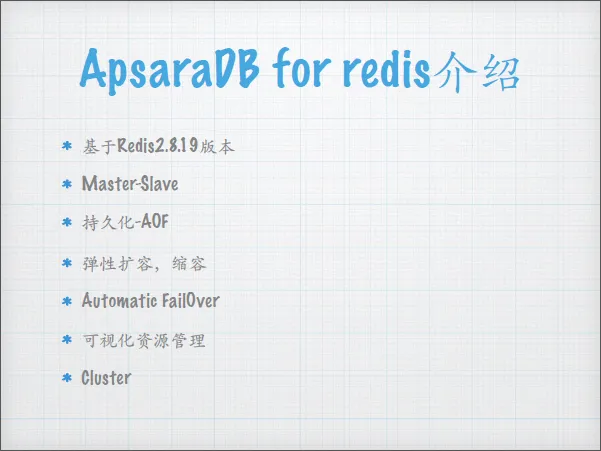 阿里云Redis云数据库主要采用了较为稳定的Redis2.8.19版本,并进行了内核优化和命令阉割,来保证业务系统安全性。整个系统采用了Master-Slave主从结构,支持AOF持久化,支持弹性扩容,自动切换,可视化资源管理,集群和Sharding等功能。