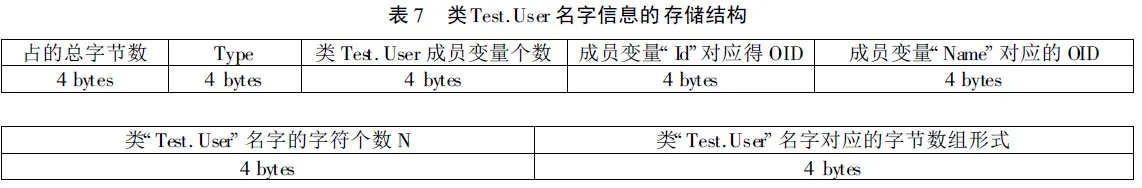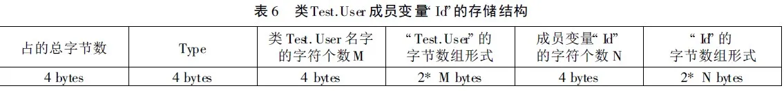 实际上Perst 在保存记录数据之前都要将记录数据的类信息保存在数据库文件中, 主要目的是实现类对象的动态加载。以类Test. User 为例说明类的存储结构, 它的两个成员int 类型( Id) 和String 类型( Name) 。Perst 先保存类的成员变量Id 和Name 的信息, 然后保存类信息。图2 是Test. User. Id 的存储结构,Test.User. Name 的存储结构和表6 类似。