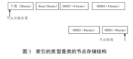 当索引是用类创建的时候, 在节点的< key, value> 对中,索引值就是该记录对象的OID, key 是该记录对象的OID 或者是子节点页对象的OID。以< OID1, OID3> , < OID2, OID4> 为例, 其中OID1 和OID2 是key, OID3 和OID4 是索引值, 且OID3< OID4 其结构如下图3 所示:图3