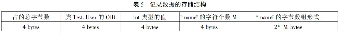 Perst 中记录数据存放位置是根据当前数据库的使用情况来为记录数据分配存储空间。Perst 中每个记录数据的存放格式都是统一的, 每个记录数据的开头占用8 个字节存放记录数据的基本信息。前4 个字节存放这条记录占用的字节个数, 后4 个字节存放构建这个记录对象的类的OID, 通过这个OID 就可以动态的加载该类的对象。以类Test. User 的记录为例, 该记录包含一个int 类型的数据和一个变量名为 name 的String 类型, 其存储结构如表5 所示。