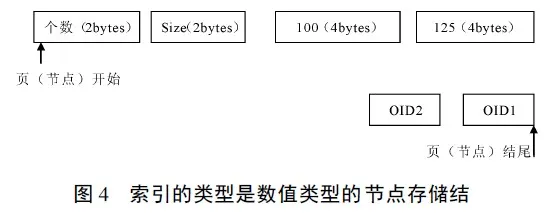 当创建索引的类型是数值类型时, 节点< key, value> 中,索引值就是该数值, key 是子节点的OID 或者是和索引值相关的记录对象的OID。以< OID1, 100> , < OID2, 125> 为例说明其存储结构, 其中索引值的类型是int, 存储结构如图4所示: