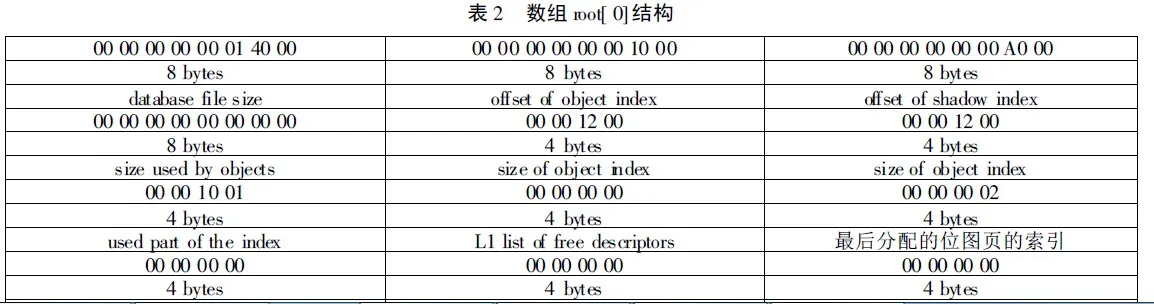 Perst 数据库文件开始的第一页中, 前139 个字节存放Perst 数据库使用情况和数据库当前状态等Header 信息。它在文件中的数据结构如图1 所示。表1 到表4 对图1 中Header 信息中的每个数据做了详细分析。数据意义如表所示。