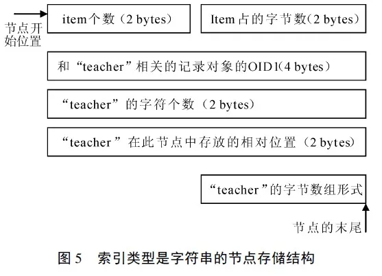 对于这种类型的索引结构, 在保存索引值的时候并不只是保存字符串或字节数组, 还会保存字符串的一些信息, 如字符串的字符个数, 字符串在该节点中存放的相对位置。以< OID1, teacher > 为例, 其存储结构如下图所示: