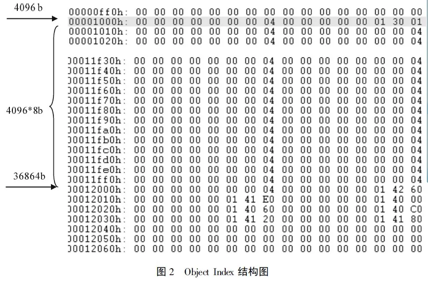 在图2 的0x00012000h 位置以前都是空闲区, 之后的才是真正存放Object Handle 的Object Index 区。如果Perst 数据库文件中的持久化对象的OID 个数超过512 个, Perst 会在数据库文件的另一个区开辟更大的存储空间充当Object Index区, 以存放更多的Object Handle。