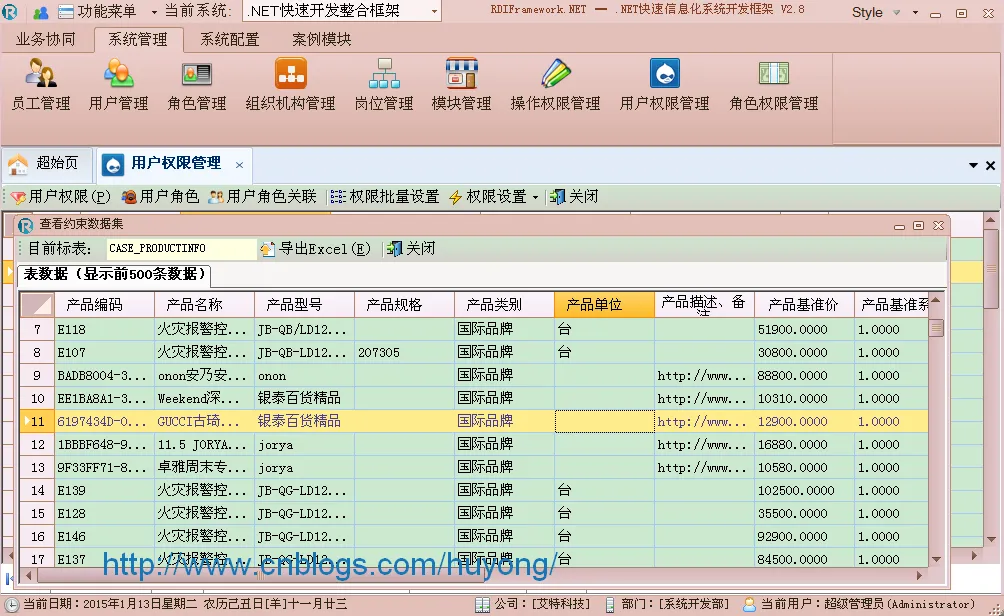 我们对用户“yonghu”设置的约束条件是单价大于10000,在上图中,可以看到系统已经自动过滤了数据共143条数据。我们再以超级管理员用户登录进来看下,如下图所示:
